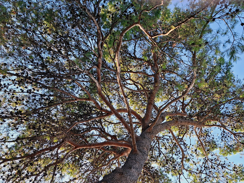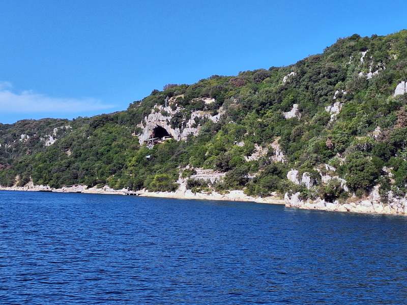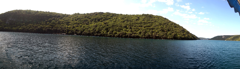 Die Flanken der Bucht sind mit dichtem Gehölzbewuchs bedeckt.