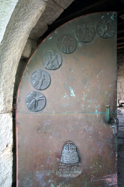 Kupfer mit den beiden großen Handgriffen und dem Türklopfer wurde 1981 eingebaut. Es ist mit zwölf glagolitischen Zeichen verziert, von denen man annimmt das Sie die Kalendermonate