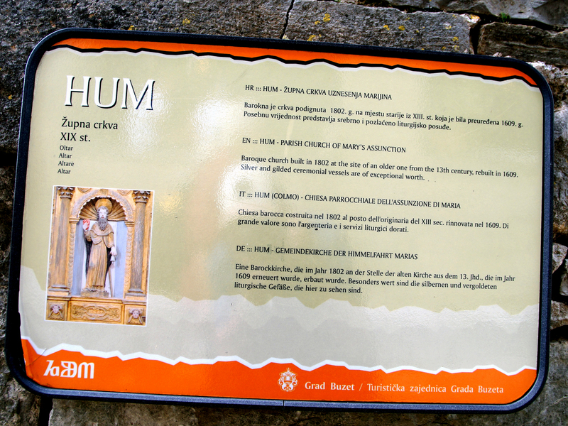 kroatischen glagolithischen Zentren, daher kann man in Hum verschiedene glagolithische Denkmäler finden. Die barocke Kirche Maria Himmelfahrt wurde 1802 an der Stelle einer älteren aus dem 13.