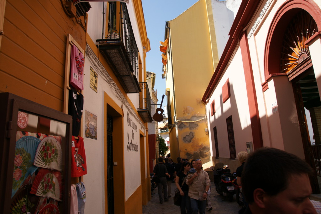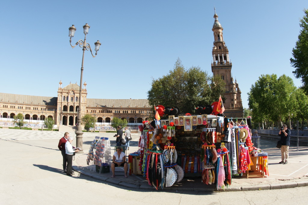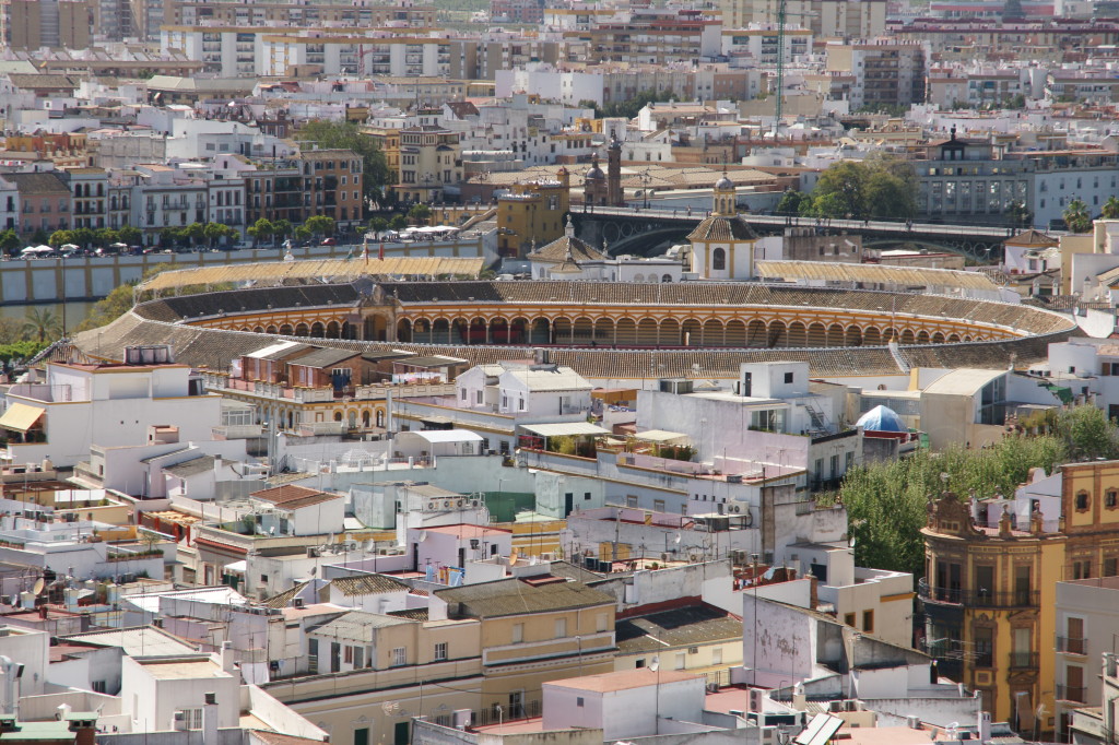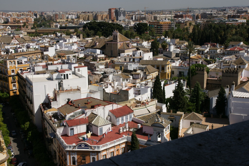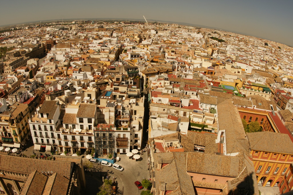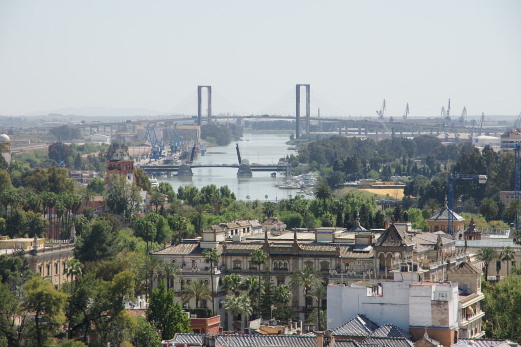 Die Stadt ist ein wichtiger Industrie- und Handelsplatz und Touristenzentrum. Sevilla liegt zu beiden Seiten des bis hierhin schiffbaren Guadalquivir, in einer weiten und fruchtbaren Ebene. Mit ihren zahlreichen Türmen bietet Sevilla von allen Seiten einen imposanten Anblick. Die eigentliche Stadt nimmt das östliche Ufer des Guadalquivir ein und ist von den Vorstädten Los Humeros, Cesteria, Baratillo, Carreteria, Resolana mit dem großen Hospital La Caridad, San Bernardo, San Roque y la Calzada und Macarena mit dem Hospital de la Sangre umgeben. Von der alten, mit 66 Türmen versehenen Ringmauer, welche die innere Stadt umgab, sind nur noch Reste vorhanden. Am rechten Ufer des Flusses breitet sich noch die große Vorstadt Triana aus.